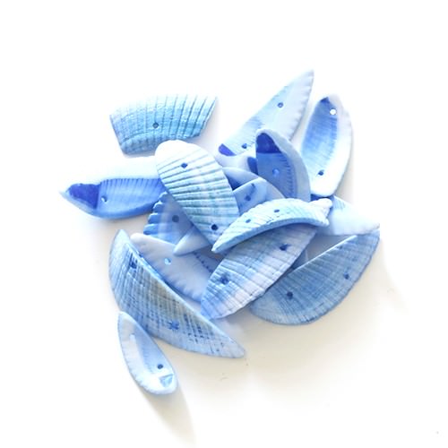 Schelpen gesneden en blauw gekleurd met twee gaatjes per schelp.